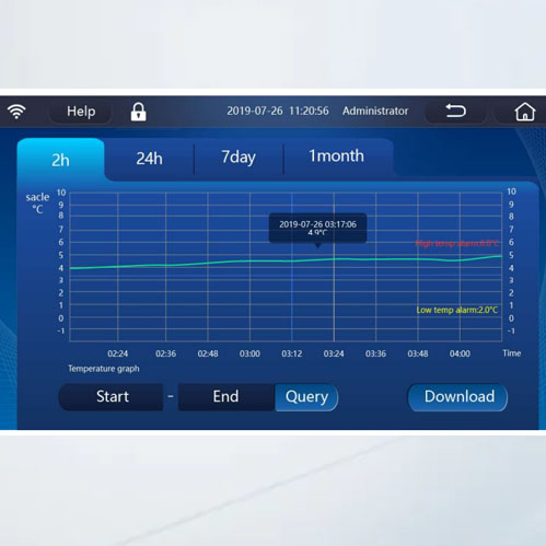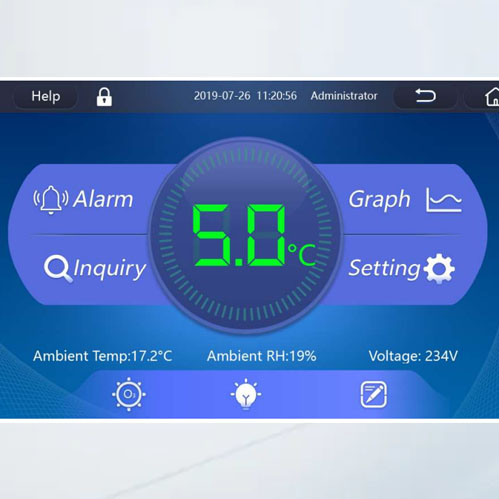 Los modelos avanzados vienen con pantalla LCD Táctil de 10 pulgadas en la cual se muestran los valores numéricos de temperatura interna, gráficas de temperatura por horas, dia, semana o mes, mensajes de alarmas, configuracion, calibración, etc.